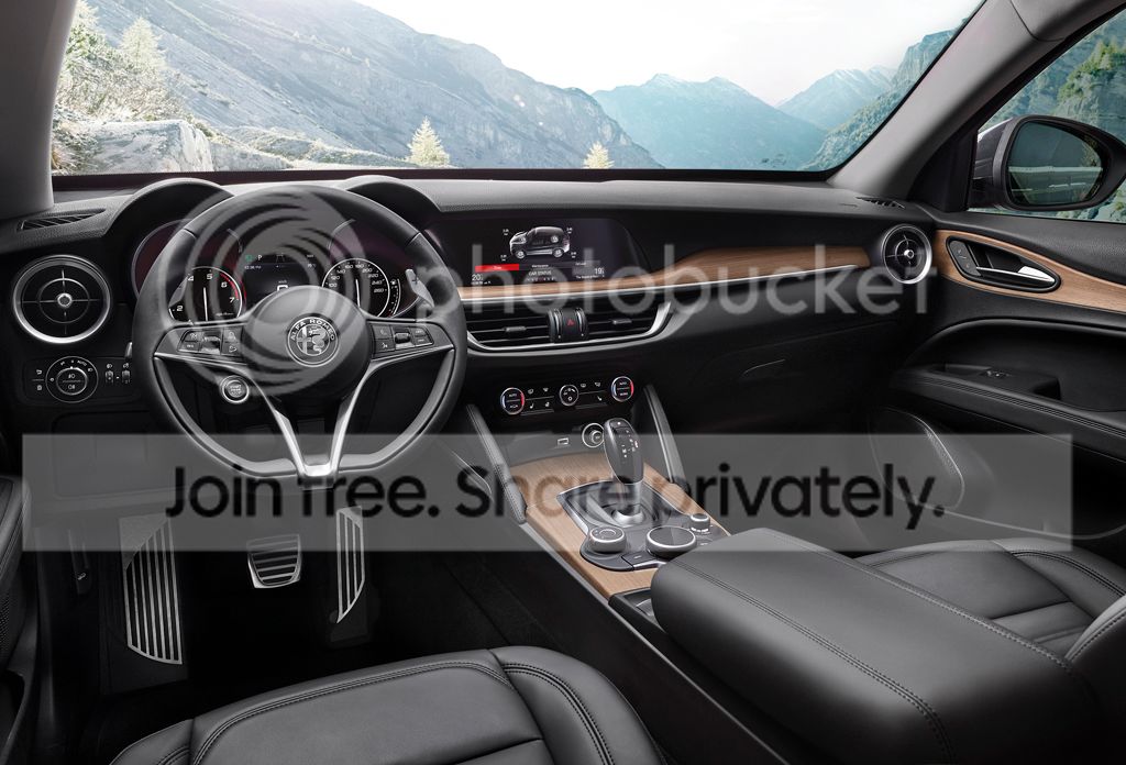 SUV modelleri arasında yeni Alfa Romeo Stelvio, sürücüsünü kendisine doğru yönlendirilmiş kumanda birimleri, çalışmtırma butonuna sahip ısıtmalı direksiyonu ve alüminyum pedalları ve ayak dayama ile de etkilemesini bilmekte. İhtiyaç halinde sürücü vitesleri direksiyon arkasındaki alüminyum vites kulakçıkları ile değiştirebilmekte. Sürücüyü doğrudan bilgilendiren merkezi ve 7" (17,8 cm) renkli bilgilendirme ekranı ve HD çözünürlüğe sahip olan 3D (3 boyutlu) navigasyonlu ortada bulunan 8,8" (22,4 cm) AlfaTM Connect ile de tüm interaktif çözümler de sunulmuş.